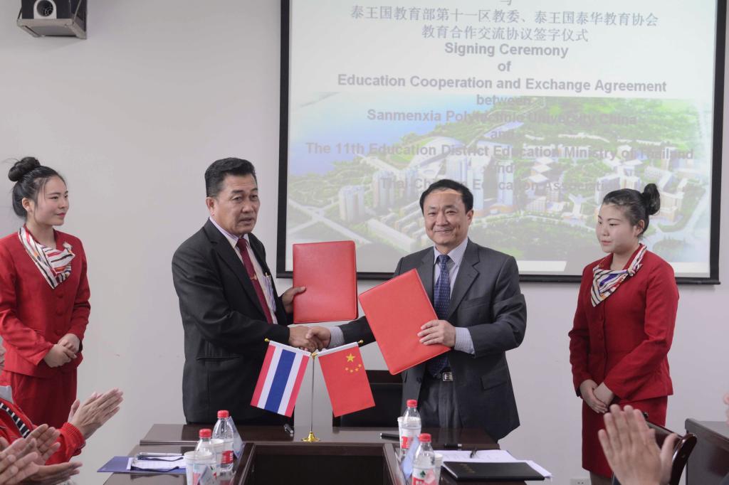 校长吴勇军在会议室会见了到访的泰国代表团,双方进行了友好的会谈并签订了教育合作交流协议。依据协议,从今年起我校每年可以选拔汉语语言相关专业的优秀学生赴泰国国立中学进行为期10个月的国际汉语援教项目。