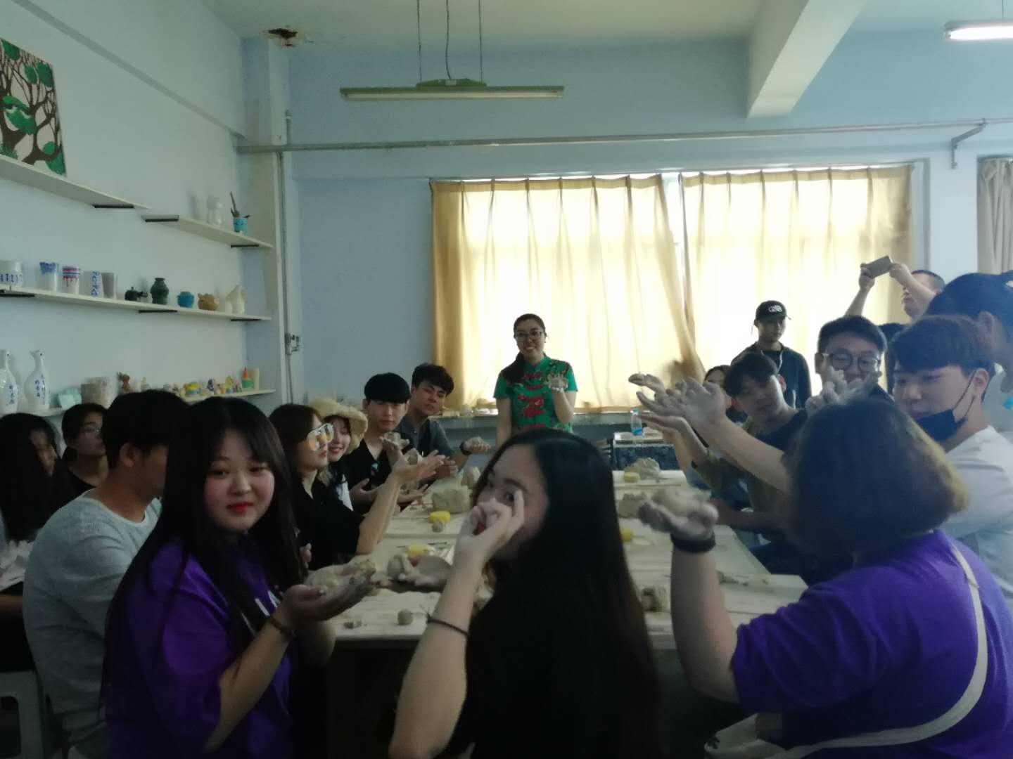 为了让韩国师生在我校期间有更多的收获,我校师范学院音乐教研室张满生教授和部分学生代表为韩国学生演唱了我国民歌《茉莉花》,并邀请韩国学生弹奏钢琴,中韩师生以一曲《友谊地久天长》结束表演。我校建筑工程学院的岳星老师一边讲解陶艺制作方法,一边手把手的教授韩国学生制作陶艺,并将做好的陶艺制品送给韩国学生留作纪念。我校经济管理学院的于杰丽老师为韩国师生上了一堂生动茶艺课,她分别从茶的种类、冲泡方法等方面详细的介绍了中国传统茶道,并邀请韩国师生共同体验。除了文化体验外,我校的学生代表与来访师生共同体验了中国传统饮食饺子的制作过程。在中韩学生联欢会上,两校学生还通过毛笔字、歌曲、舞蹈等方式进行广泛交流。