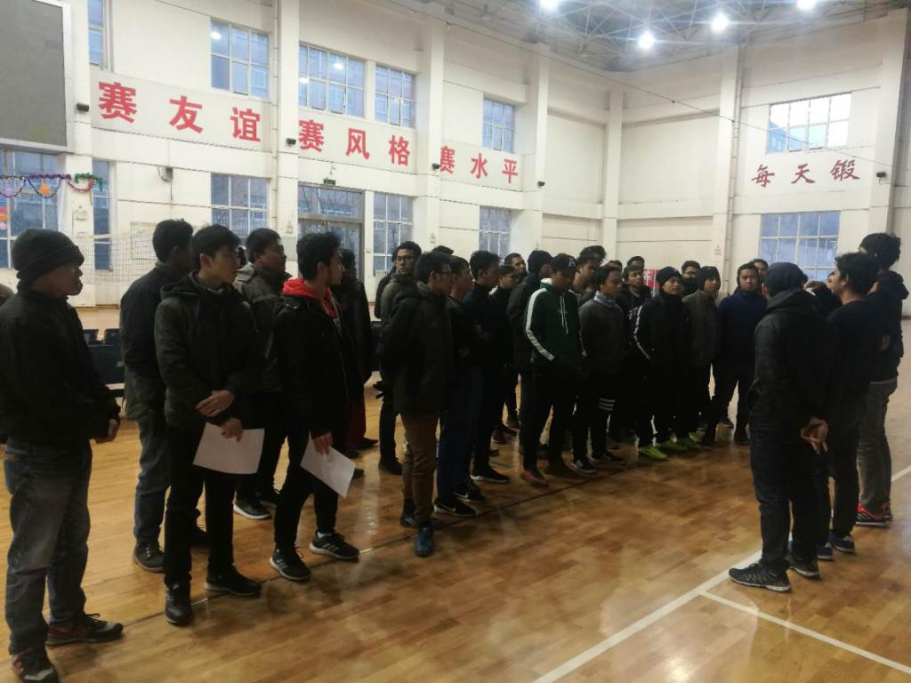 比赛开始前,国际交流学院安排专业人员带领留学生做热身运动,避免因热身不充分而导致在紧张激烈的比赛中发生扭伤。在比赛进行过程中,全体参赛人员用心投入、全力以赴,尽最大的努力打好每一个球,充分展现了留学生的青春与活力。同时,场下的观众们也饶有兴致地观看比赛,为参与比赛的同学们加油、喝彩,与场内的热烈气氛融为一体。比赛结束后,学院老师为留学生们颁发了果篮、笔记本等奖品,并送上新年的祝福。
