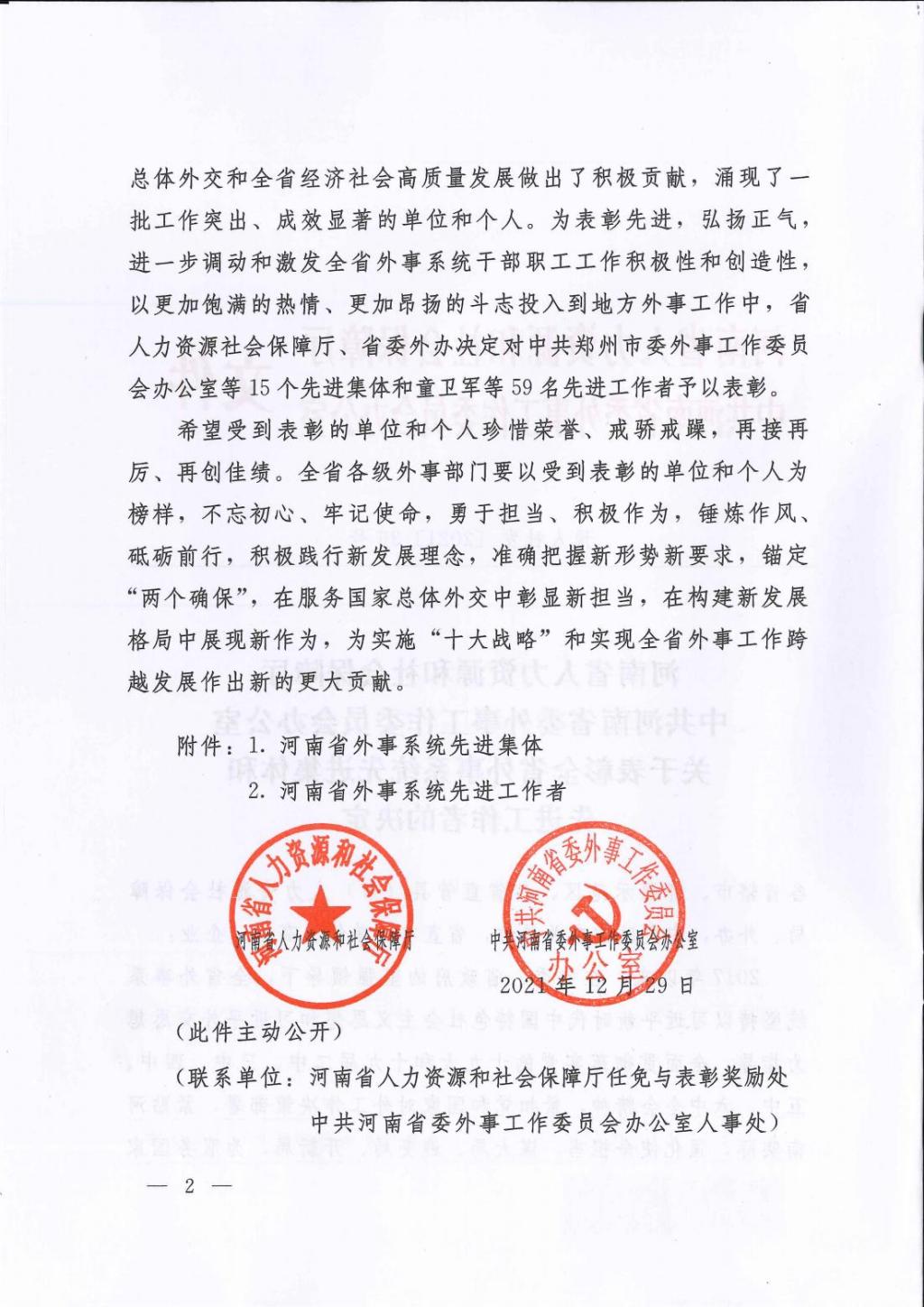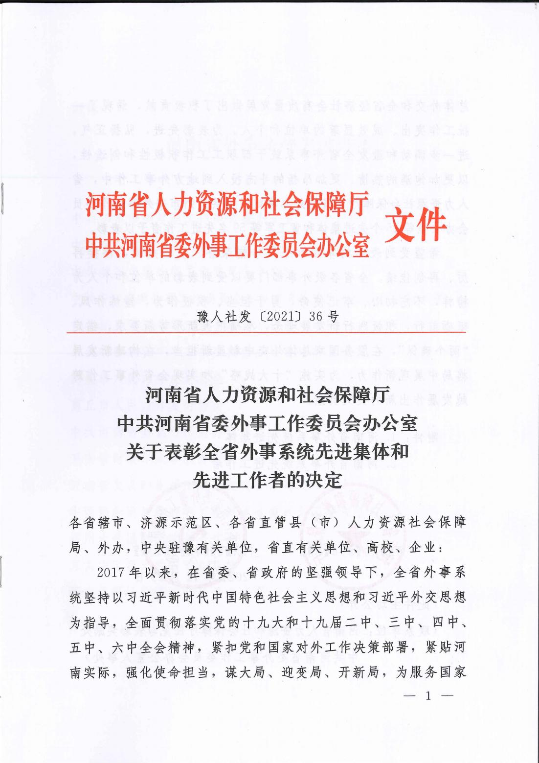 2021年12月29日,河南省人力资源和社会保障厅、中共河南省委外事工作委员会办公室联合发文《关于表彰全省外事系统先进集体和先进工作者的决定》(豫人社发[2021]36号),我院教师霍焱获“河南省外事系统先进工作者”称号。