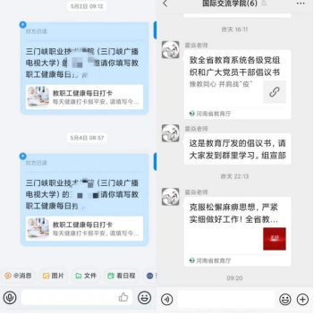 三、通过微信工作群、钉钉群等及时发布相关防疫通知,宣传防疫知识,提高部门教职员工自我防护和健康管理能力,并严格展开数据统计和上报工作。