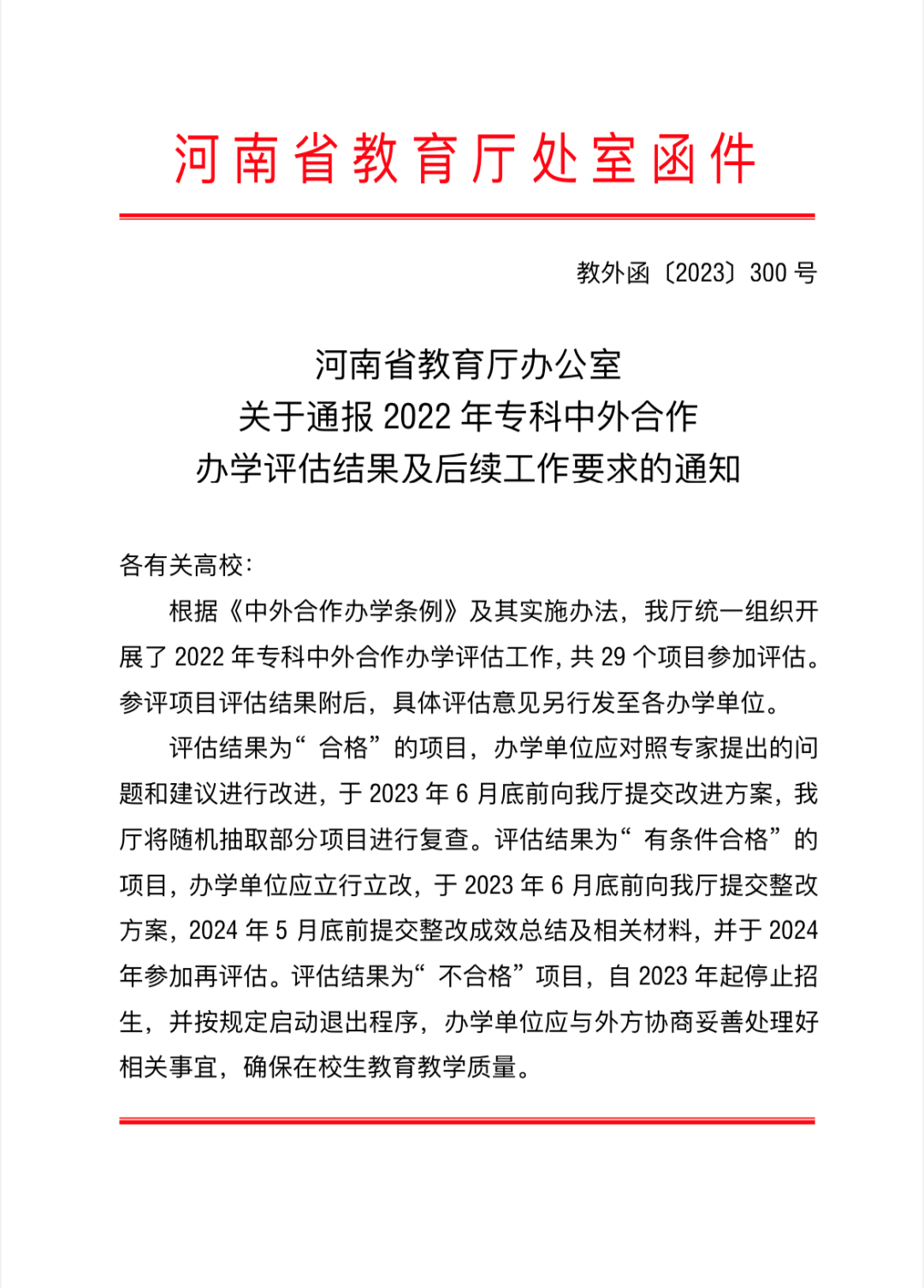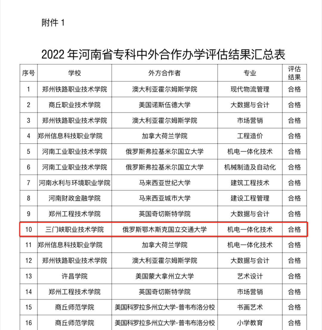 近日,河南省教育厅公布了2022年专科中外合作办学评估结果。我院与俄罗斯鄂木斯克国立交通大学合作举办的机电一体化技术专业专科教育项目顺利通过省教育厅评估。