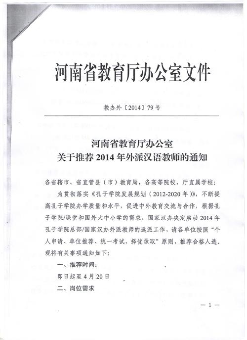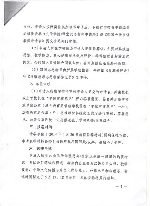 为贯彻落实《孔子学院发展规划(2012-2020)》,不断提高孔子学院办学质量和水平,促进中外教育交流与合作,根据孔子学院和国外大中小学的需求,国家汉办决定启动2014年孔子学院外派教师的选派工作,现将有关事项通知如下: